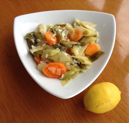 Üzerine verev şeklinde doğranmış havuçlar ve pırasalar ilave edilir. (Pırasaların rengi yeşillenip biraz sünene kadar) Sotelenir. 1 yemek kaşığı pirinç eklenir. Kalan diğer portakal ve 1 limon sıkılır. Suyu bir su bardağına konur. Bardağın kalan kısmı zeytinyağı ile doldurulur. Tuz da bu bardağa ilave edilir ve yemeğin üzerine gezdirilir.