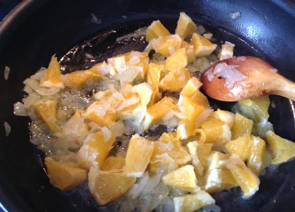 Tavaya iki yemek kaşığı kadar zeytinyağı ve ince kıyılmış soğanlar koyulur; sotelenir. Daha sonra 1 portakalın kabuğu soyulur, yuvarlak bir sekilde dilimlenir. Sonrasinda bu yuvarlak dilimler daha da minik hale getirilir.