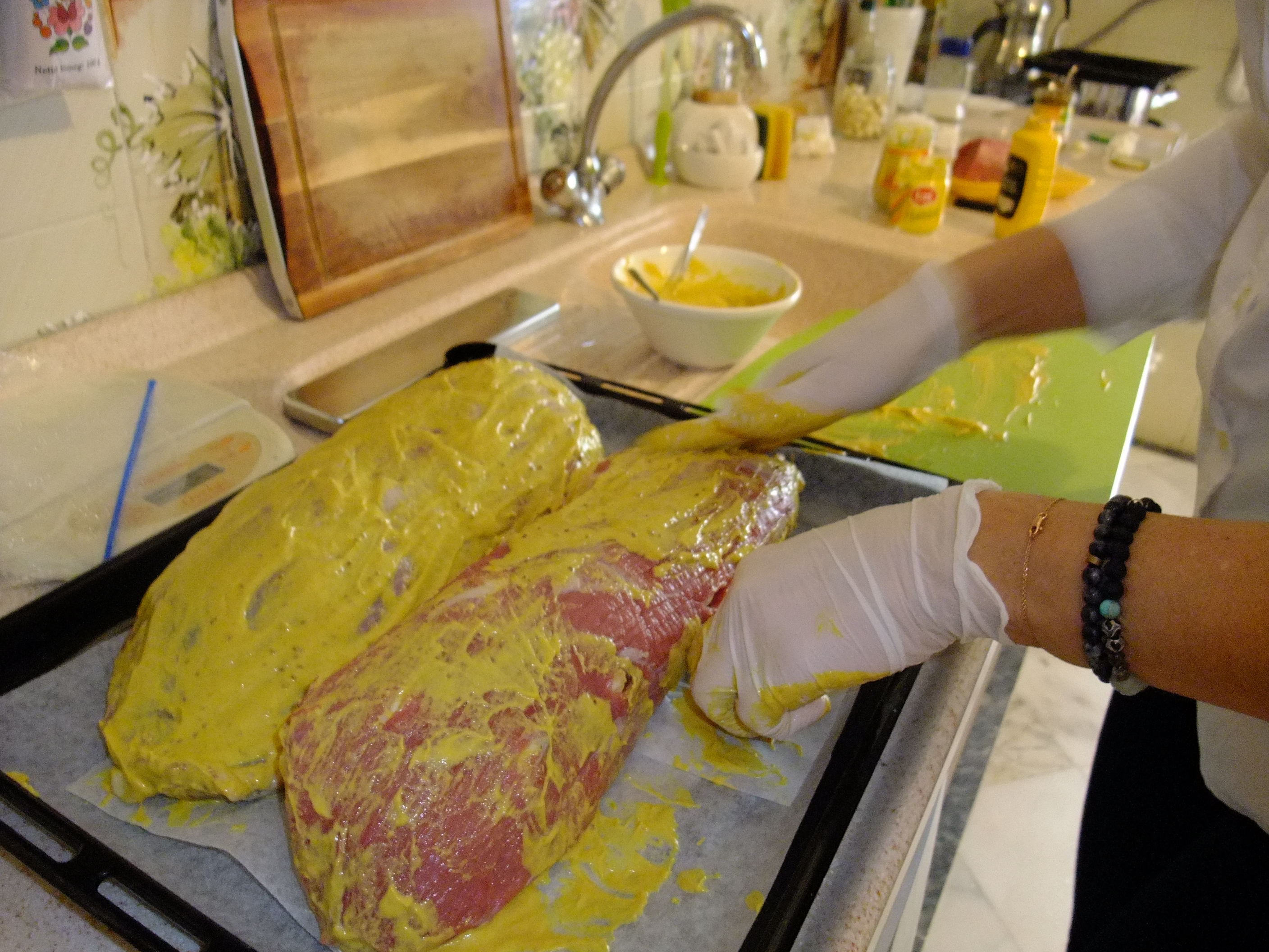 Sarımsaklanan et hazırlanan hardal sosla bol miktarda her tarafı soslanır. Tepsiye değecek kısmına da gelecek şekilde hardal sürüldükten sonra fırın kağıdı yayılmış tepsiye yerleştirilir. Üzerine tekrar kağıt yayılarak kapatılır.
